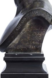 in bronzo, firmato sul bordo laterale destro GAYRARD SCULP. 1846, su piedistallo in marmo nero del Belgio modanato inciso sul fronte “FRANÇOIS CABROL”, inciso sui lati “François Gracchus Cabrol/ né a Rovez/ le 17 février 1793/ mort à Paris / 6 juin 1882” e “Eléve de l’ecole Polytechnique/ 1809/ Capitaine d’artillerie de la jeune garde / 9 decembre 1813/ Chevalier dela légion d’honneur / 17 août 1822/ Crèa la Forézie – Firmy 1827, Decazeville 1830/ Officier de la legion d’honneur/ juin 1841/ Député du département de l’Aveyron / 1846/ Membre du Conseil- Géneral de l’Aveyron/ Maire de Decazeville- / etc- etc-", cm 70x42x30