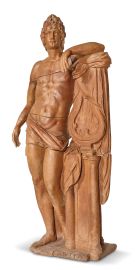 in terracotta raffigurato in posizione stante accanto alla cetra, poggiata su una colonna, cm 225x100x70