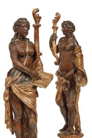 in legno laccato e dorato raffiguranti figure femminili stanti drappeggiate all'antica, ciascuna con una fiaccola e un libro, su base circolare profilata da perlinatura e intagliata a foglie intervallate a tre piedini a ricciolo, alt. cm 115 e 117