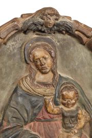 bassorilievo di forma centinata in terracotta dipinta in policromia, profilato da bordura a foglie ricorrenti intervallate da cherubini, cm 65x46x10