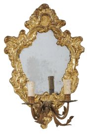 in legno intagliato e dorato, di forma sagomata intagliata a motivi rocaille che dal centro inferiore, con due braccetti ricurvi a elementi fogliacei, si portano in alto a creare ampio motivo rocaille a foglia aperta che inquadra decoro inciso a piccoli rombi, cm 49x33
