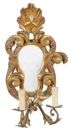 in legno intagliato e dorato, profilo di linea sagomata a volute fogliacee che dal centro inferiore, segnato da due braccetti fogliacei ricurvi, si portano in alto a inquadrare la cimasa, a foglia aperta centrata da stella, cm 49x32,5