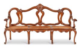 in noce, seduta incannucciata, schienale sagomato a giorno a motivo di volute a formare al centro superiore motivo a palmetta, braccioli mossi terminanti a ricciolo su sostegno sinuoso, grembiale tripartito profilato da volute a inquadrare ai centri motivo vegetale, otto gambe mosse terminanti a ricciolo, cm 101x185x63