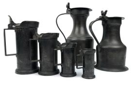 in peltro di due diversi modelli, uno cilindrico con presa lineare e uno a vaso con presa curvilinea sormontata all’attacco con il coperchio da motivo a due ghiande, tutti punzonati, alt. da cm 32 a cm 11,4