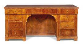 lastronata in piuma di mogano, piano di forma rettangolare, fronte a un cassetto centrale affiancato da due cassetti più stretti ai quali seguono altri tre cassetti per lato, retro a tre cassetti sotto la fascia dei quali il centrale di larghezza doppia cui seguono quattro sportelli ciascuno realizzato come tre finti cassetti, piedi a mensola, cm 78,5x175x87