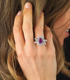 in oro bianco 18kt, al centro un rubino taglio ovale di ct 3.80 circa, circondata da diamanti taglio brillante e navette per ct 3.80 circa, mis. 53, gr. 8