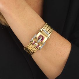 in oro giallo 18kt a maglia morbida, fermatura composta da una clip a forma di fibbia con rubini taglio rotondo per ct 0.60 circa, diamanti taglio vecchio per ct 0.60 circa, intercambiabile con seconda clip a riprendere il motivo a maglia morbida del bracciale, punzoni del fascio e 750, lungh. cm 20, gr. 110