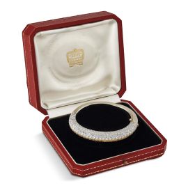 probabilmente pezzo unico, in platino e oro giallo 18 kt con pavè di diamanti fancy e bianchi taglio brillante per ct. 18 circa, firmato “Cartier Paris”, punzoni francesi, diam. cm 6,5, gr. 46. Corredato di scatola.