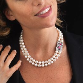 a doppio filo di perle di mm 10 circa, fermatura in oro bianco 18kt impreziosita da due pietre rosse taglio ovale circondate da diamanti taglio brillante per ct 1 circa, punzoni 750 e del fabbricante, lungh. cm 46, gr. 127
