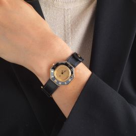cassa di forma ottagonale in oro giallo 18kt e acciaio brunito, fondello serrato con viti, lunetta con numeri romani, color oro, quadrante oro, grafica nera, movimento al quarzo, cinturino in pelle, vetro minerale. Dim. mm 29x29