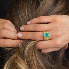 in oro giallo e bianco satinato 18kt, al centro uno smeraldo taglio ottagonale di ct 4.70 circa, firmato "M.Buccellati", punzoni 750 e del fabbricante, mis. 58, gr. 14. Corredato di scatola.