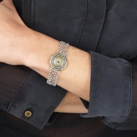 cassa ottagonale in oro giallo 18kt, ghiera rivestita in smalto e piccole rose di diamante, quadrante argentè con lavorazione guilloché, numeri arabi, movimento a carica manuale, firmato "Marzo et Laillet Paris", bracciale in oro bianco 18kt e microperle a maglia tessita, fermatura in oro giallo e bianco 18kt, lungh. cm 16,5, gr. 24 (Danni). Dim. mm 23x23
