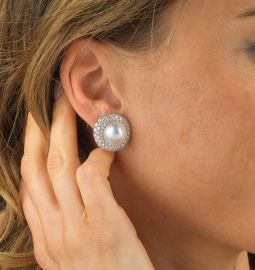 BUTTON PEARL AND DIAMOND EARRINGS IN 18KT WHITE GOLD