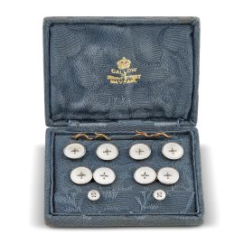 composto da paio di gemelli e bottoni, in oro giallo 18kt e platino, punzoni 18kt e PT, dim. gemelli cm 1,5x3 circa, diam. bottoni cm 1 circa, gr. 17 complessivi. Corredato di scatola.