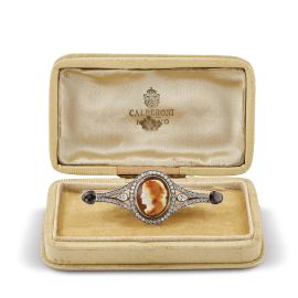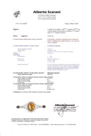 in oro e argento, al centro un cammeo in corniola con inciso il profilo di Bacco con tralci di vite fra i capelli, circondato da diamanti taglio brillante per ct 1.33 circa, colore G/K, purezza Vvs/SI e due diamanti taglio a goccia per ct 0.38 circa, colore H/I, purezza Vvs/Vs, all'estremità due zaffiri viola taglio misto per ct 1.80 circa, punzoni olandesi, dim. cm 2,5x6,5, gr. 12. Corredata di certificato del 9/03/2021 rilasciato da Dott. Scarani Alberto attestante le caratteriste.