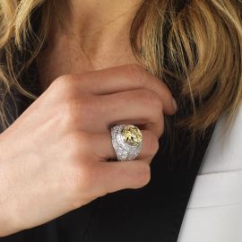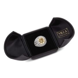 in oro bianco 18kt, sulla sommità un diamante sintetico di ct 7 circa, circondata da diamanti taglio brillante, carré e tapes per ct 5 circa, firmato "Villa", mis. 56, punzoni 750 e del fabbricante, gr. 15. Corredato di scatola.
