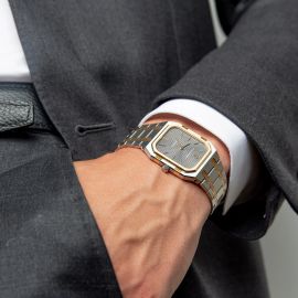 cassa in acciaio e oro 18kt, lunetta in oro giallo 18kt, quadrante ardesia, indici applicati, movimento al quarzo n. 200680 cal. 2511, bracciale acciaio e oro 18kt, fibbia deployant in acciaio, vetro minerale. Dim. mm 32x41