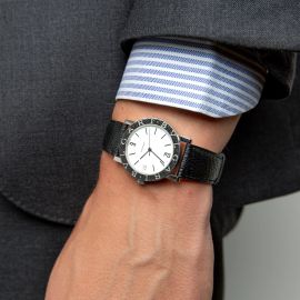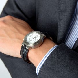 cassa in oro bianco 18kt, lunetta in acciaio satinato marcata Bulgari, quadrante bianco, indici applicati, movimento a carica automatica con funzione crono e tempi regata, cinturino in pelle, chiusura deployant in oro bianco 18kt, vetro minerale. Corredato di scatola e garanzia. Diam. mm 40