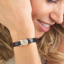 cassa in oro giallo 18kt, corona di carica posta sul fondello, ghiera liscia, quadrante argentè, grafica nera, indici oro applicati, movimento a carica manuale, cinturino in pelle, fibbia placcata oro originale marcata JLC, vetro plastica. Diam. mm 14. gr. 8