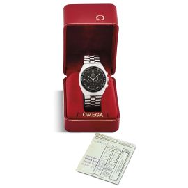 cassa tonneau in acciaio, fondello serrato a vite con logo Speedmaster, quadrante nero, grafica di colore bianco, indici al trizio, movimento a carica manuale n. 30598261 cal. 861, bracciale in acciaio, fibbia con chiusura marcata Omega ref. 1159, vetro minerale con serigrafato internamente scala cronografica medicale a 15 pulsazioni. Corredato di scatola e garanzia. Dim. mm 41,5x45