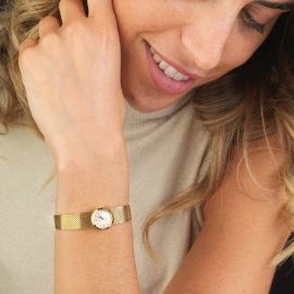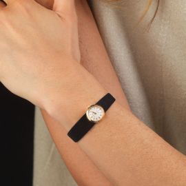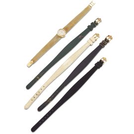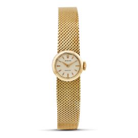 cassa in oro giallo 18kt con ansa passante sotto il fondello, lunetta liscia in oro giallo 18kt, quadrante argenté, grafica di colore nero, indici oro applicati, movimento a carica manuale, bracciale in oro giallo 18kt removibile con sistema di aggancio rapido all'orologio, lungh. interna cm 16, vetro minerale. Corredato di astuccio non originale e di quattro cinturini in pelle in vari colori con fibbie originali. Diam. mm 16, gr. complessivi 36