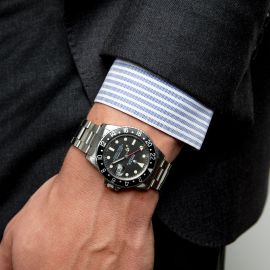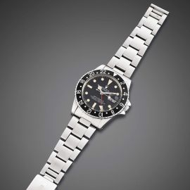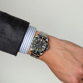 cassa in acciaio, fondello serrato a vite, ghiera girevole in acciaio con inserto GMT di colore nero, quadrante nero transizionale a pallettoni grafica di colore bianco, indici al trizio applicati, datario a ore tre, movimento a carica automatica, bracciale oyster in acciaio ref. 78360 finali 580, fibbia a scatoletta marcata Rolex anno di produzione 1982, vetro plastica. Diam. mm 40