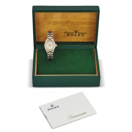 cassa in acciaio, fondello serrato a vite, ghiera zigrinata in oro giallo 18kt, quadrante argenté, grafica di colore nero, indici oro applicati, movimento a carica automatica n. 62194 cal. 1161, bracciale Jubilee a maglie ripiegate in acciaio e oro giallo 18kt finali ref. 263 cod. produzione 4.70, lungh. cm 16, fibbia in acciaio marcata Rolex ref. 6251D, vetro plastica. Corredato di scatola e garanzia. Diam. mm 25