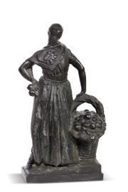 La bella scultura di Libero Andreotti che abbiamo il piacere di presentare raffigura una giovane donna in piedi con le gambe incrociate colta in un momento di riposo dopo aver posato a terra un grande cesto di frutta. Le pieghe della veste accompagnano le forme del corpo, mentre la mano sinistra, che poggia con grazia sul fianco, tiene nel palmo un frutto. Forte è il legame con i modelli dello scultore francese Émile-Antoine Bourdelle – a cui Andreotti guardò con molta attenzione – in particolare con il bronzetto raffigurante La moglie dello scultore, con cui la nostra condivide la costruzione solida della figura e la posizione del braccio destro, leggermente arcuato, tramite il quale la donna scarica il proprio peso sull’oggetto al suo fianco.