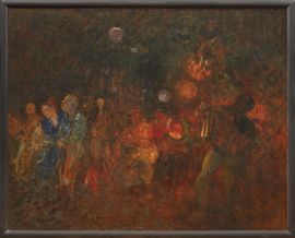 In questo gioioso dipinto Plinio Nomellini evoca la festosa atmosfera notturna di una delle più antiche e tradizionali feste della città di Firenze, quella della Rificolona, che si festeggia il 7 settembre di ogni anno. Fin dalla metà del '600 in questo giorno contadini e montanari scendevano in città con le proprie compagne per rendere omaggio, il giorno successivo, alla nascita della Madonna in piazza Santissima Annunziata, illuminando il loro cammino con piccoli lampioncini fatti a mano e cogliendo l'occasione per portare i loro prodotti al mercato (la Fierucola). Le contadine e montanare erano oggetto di particolari e allegre canzonature da parte dei giovani fiorentini che si riversavano in piazza chiamandole “fierucolone”, sia per la loro partecipazione alla Fierucola sia per il loro aspetto ‘rustico’. Da “fieruculona” deriva la parola “rificolona”, tuttora comunemente usata a Firenze quale espressione critica, allegra e scanzonata verso una donna vestita e truccata senza gusto, in modo vistosamente eccentrico. Nel corso del tempo le lanterne che accompagnavano i pellegrini furono sostituite dalle famose luci di carta – le rificolone – di derivazione cinese, che la sera del 7 settembre i bambini portano a spasso per le strade di Firenze e attaccano lanciando pallini di stucco con le cerbottane.