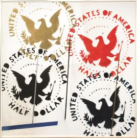 “Quella di Franco Angeli è poetica del frammento. Così ingrandisce i particolari delle monete americane secondo inquadrature che non sono mai uguali. I suoi simboli sono svastiche e falci e martello usate come simbologie negative e positive. Riproducendo le aquile americane e i mezzi dollari, egli porta alla luce la vacuità di quelle immagini, di quella stessa società dei consumi che la Pop americana stava invece celebrando."