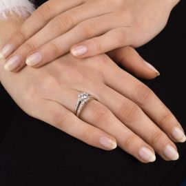 in oro bianco 18kt, a due file di piccoli diamanti taglio brillante per ct 0.25 circa, recante sulla sommità un diamante taglio brillante di ct 0.40 circa, punzone 750, mis. 58, gr. 7