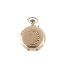 cassa in quattro parti in oro 18kt, fondello con mezzaluna e stella incise con microperle applicate, quadrante bianco in porcellana, numeri romani, scala 24 ore con numeri arabi blu, movimento a carica manuale, vetro plastica, gr. 18. Diam. mm 28