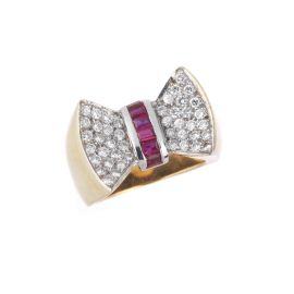 in oro giallo e bianco 18kt, di cui un anello a forma di fiocco con rubini taglio baguette per ct 0.35 circa e diamanti taglio brillante per ct 0.40 circa, punzone 750, mis. 54, gr. 12; un anello di forma geometrica con smeraldi taglio baguette per ct 1 circa e diamanti taglio baguette e brillante per ct 0.80 circa, mis. 58, gr. 8; un anello di forma geometrica con smeraldi taglio ovale per ct 1 circa e diamanti taglio brillante per ct 0.10 circa, punzoni 750 e del fabbricante, mis. 54, gr. 15; un anello in oro bianco 18kt con zaffiri taglio smeraldo per ct 2 circa e diamanti taglio brillante per ct 1.10 circa, punzone 750, mis. 53, gr. 5