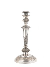 in argento, base quadrata appesantita, fusto scanalato terminante con capitello corinzio, alt. cm 33, g 1060 lordi