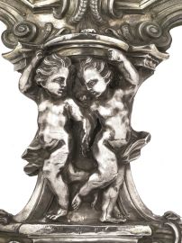 in argento e legno, base sagomata su cui poggia il sostegno realizzato da due putti in rilevo su elementi a volute, parte centrale con iscrizione incisa, cornice con due santi assisi e due putti sovrastanti che sostengono uno stendardo con il volto di Cristo, cm 74x54x19, g 5300 lordi