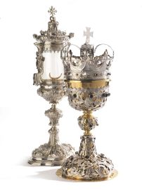 in argento, base sagomata e sbalzata con volute, fusto con nodo piriforme, sottocoppa decorato da teste di putti tra foglie in rilievo che si ripetono sul coperchio, coppa in vetro sostenuta da due elementi in foggia di pampini d'uva, finale del coperchio a croce su globo, base appesantita, alt. cm 52, g 1375 lordi