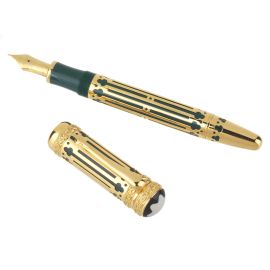 corpo decorato in lacca verde scuro e circondato da delicati trafori placcati in oro, cappuccio con dettagli di rifinitura raffiguranti ghirlande di fiori e sormontato dall'emblema a stella bianca, pennino in oro giallo 18kt con incisa l'acquila imperiale russa, punzoni Montblanc e 750, caricamento a stantuffo, lungh. cm 14. Corredata di scatola, controscatola e garanzia.
