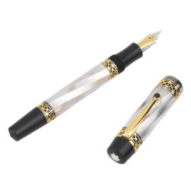 corpo in argento sterling 925, dettagli di rifinitura placcati in oro con fregi ornamentali che ricordano i motivi decorativi della cattedrale di Aquisgrana, dove Carlo Magno fu incoronato, pennino in oro bicolore 18kt, punzoni Montblanc e 750, caricamento a stantuffo, lungh. cm 14. Corredata di scatola, controscatola e garanzia.