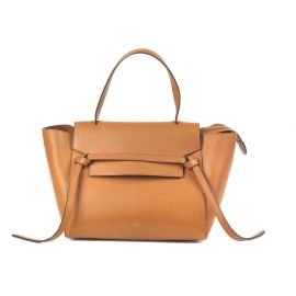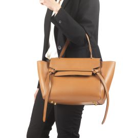 in cuoio naturale resistente sfoderato, con caratteristico doppio nodo frontale a chiusura della pattina con calamita, logo stampato in oro sulla parte frontale in basso, un manico per esser portata a mano, tasca con zip sul retro, piedini in metallo color oro alla base, doppia tasca interna portacellulare. Con dustbag originale.