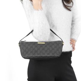 in denim GG nero, da portare a mano o sottospalla grazie al manico in pelle nera, chiusura con zip e placca in metallo color oro con logo.