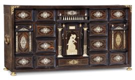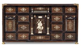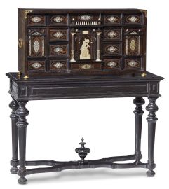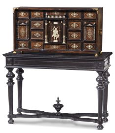lastronati in palissandro con profili in ebano, applicazioni in bronzo dorato e intarsi in osso, lavorati in modo tale che uno stipo rappresenti il negativo dell'altro. Fronte scandito in tre corpi con al centro sportello di forma architettonica entro colonnine intarsiate a ramages alla base a sostenere finto balcone e poste a inquadrare al centro figura di soldato incisa in osso entro nicchia con timpano spezzato sormontata agli angoli superiori da motivo a vaso; parti laterali simmetriche, con un cassetto in alto e uno in basso, ciascuno ornato da duplice cornice rettangolare modanata a inquadrare ramages vegetali intervallati nella fascia centrale interna da due cassetti sormontati analogamente decorati affiancati da alto cassetto di linea architettonica a timpano triangolare sostenuto da paraste ornate a ramages vegetali e ornato al centro da riserva sagomata a inquadrare motivo a racemi; angoli superiori impreziositi da applicazioni in bronzo dorato realizzate a giorno a motivi vegetali stilizzati, sommità e fianchi decorati da riserve geometriche con maniglie in ferro battuto al centro dei fianchi, piedini in bronzo dorato a sfera schiacciata, cm 56,5x107x34,5; su basi ebanizzate non pertinenti, piano rettangolare con bordo a becco di civetta, fronte e lati sformellati su sostegni a balaustro riuniti da traverse sagomate con vaso centrale, cm 89,5x130x51 e cm 89,5x125,5x49