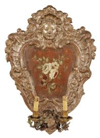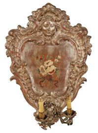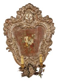 in legno laccato e dorato a mecca, di forma sagomata con battuta profilata da volute seguita da ampia fascia intagliata a nastro pieghettato a inquadrare al centro superiore volto femminile coronato da palmetta dalla quale ricadono mazzetti di foglie che si portano sui lati, al centro inferiore due volute convergenti inquadrano due braccetti in lamina di metallo policroma foggiati a rami fioriti con piattelli e bobeches in legno intagliato a elementi vegetali, interno dipinto a mazzetto di fiori trattenuto da nastro; sul retro bollino ANTICHITÀ PIETRO ACCORSI TORINO, cm 78,5x55