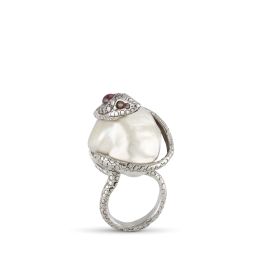 in oro bianco 18kt, grande perla barocca di mm 20x21 circa, cinta da un serpente impreziosito sul capo da tre piccoli rubini e diamanti taglio brillante, mis. 49, gr. 25