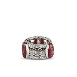 in platino e oro bianco 18kt, composto da tre file di diamanti taglio huit huit per ct 0.60 circa e come distanziali tre rubini con incisioni, mis. 42, gr. 8