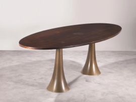 AN OVAL TABLE, BRONZE LEGS AND WOODEN TOP