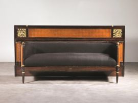 A SOFA, INLAID WOOD STRUCTURE, BLACK FABRIC UPHOLSTERY