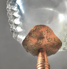 TWO APPLIQUES, DECORATED COPPER AND GLASS STRUCTURE