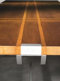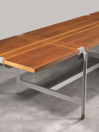 Non si conoscono mobili da lui disegnati per la serie ed è per questo che questo pezzo unico disegnato per la sala da pranzo di Moreno Bacci, committente, nel 1964, per la casa di Via Piagentina a Firenze (uno degli edifici più emblematici dell’architettura di Savioli), acquisisce un particolare valore, perché ci dà la cifra di quello che questo grande architetto concepiva come mobile che deve trovare un nesso con il contesto. In questo caso infatti la struttura portante del tavolo fortemente connotata, è realizzata con la stessa finitura brillantata che si ritrova nel pluviale dell’edificio, in tutte le ringhiere, nel corrimano, nel cancello, finitura e materiale che evitano il cromo del razionalismo e il colore di ogni tendenza. Il dettaglio ricorrente è la piastra che nell’edificio serve al fissaggio delle ringhiere mentre nel tavolo serve a contenere entro precisi limiti la dimensione del piano dettandone la misura. Anche la scelta dell’essenza sembra coincidere con quella usata per gli infissi a dimostrazione della ricerca di una precisa identità.