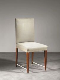 I mobili coordinati oggetto della presente, consistono in un mobile bar, in un tavolo da pranzo entrambi rivestiti in pergamena e in 6 sedie. Le caratteristiche dei complementi ci fanno supporre che facciano parte del medesimo arredamento. La proprietà di questi oggetti è della famiglia Rossi, sin dagli anni ’50, lo dimostra il servizio apparso sulla rivista Domus n° 329 – aprile 1957, dove si intravedono il tavolo e la sedia. In questo caso i complementi d’arredo in oggetto non sono stati progettati per l’appartamento illustrato nella rivista, ma forniti da Mario Simonotti all’architetto Fernando Rossi, con cui era solito collaborare perchè imprenditore nel campo dell’arredamento. Mario Simonotti diventa socio di Amilcare Asnago, proprietario della ditta ” Asnago Cesare & figli di Amilcare Asnago, Barlassina, mobili” e fratello dell’architetto Mario Asnago. Molti mobili disegnati da Asnago-Vender venivano realizzati nella ditta di mobili del fratello e questo spiega la connessione tra Simonotti ed Asnago - Vender. Il figlio Luca Rossi ricorda questi mobili sono da sempre nella loro casa.