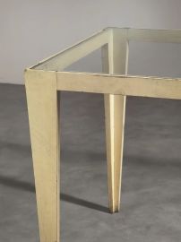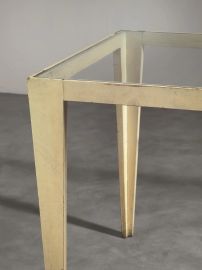 A TABLE, WOODEN STRUCTURE COVERED WITH PARCHMENT, GLASS TOP